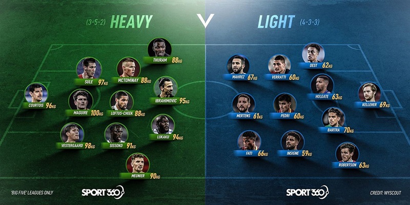 유럽 대회에서 활약으로 선수들의 행선지가 바뀔 수 있다는 소식을 더욱 기대해볼 수 있는 현재 스포츠 매체은 “SPORT360″은 “무거운 축구 선수 올스타 VS 가벼운 축구 선수 올스타”라는 주제로 축구 팬들에게 찾아왔다.